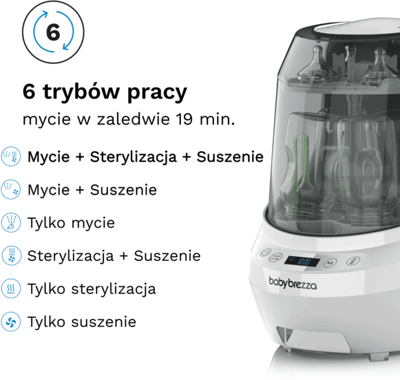 - 6 trybów czyszczenia: Mycie-Sterylizacja-Suszenie; Mycie-Suszenie; Tylko Mycie; Sterylizacja-Suczenie; Tylko Sterylizacja; Tylko Suszenie