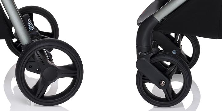 Koła wózka są bezobsługowe - dzięki temu Baby Design Wave prowadzi się niezwykle lekko i przyjemnie, a wyposażone w bieżniki zapewnią lepszą przyczepność do podłoża. Ponadto, wszystkie koła posiadają miękką amortyzację, co będzie dodatkowym wsparciem podczas spacerów po trudniejszym terenie.