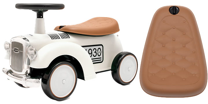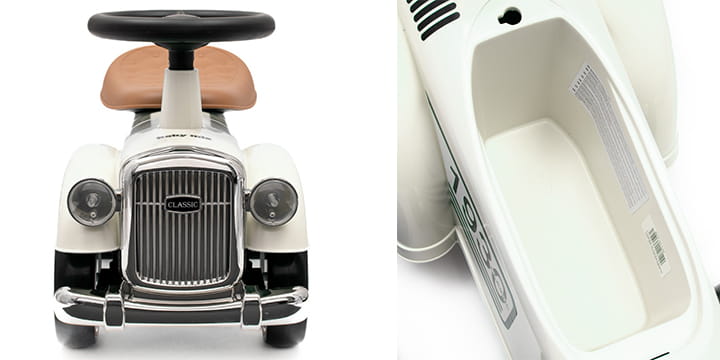 Nasz retro jeździk to coś więcej niż tylko pojazd – to pełnoprawne centrum zabawy. Wyposażony w realistyczną kierownicę z klaksonem, otwarty schowek na zabawki, imitację zbiornika paliwa oraz elegancki srebrny grill, stanie się ulubioną zabawką Twojego dziecka.