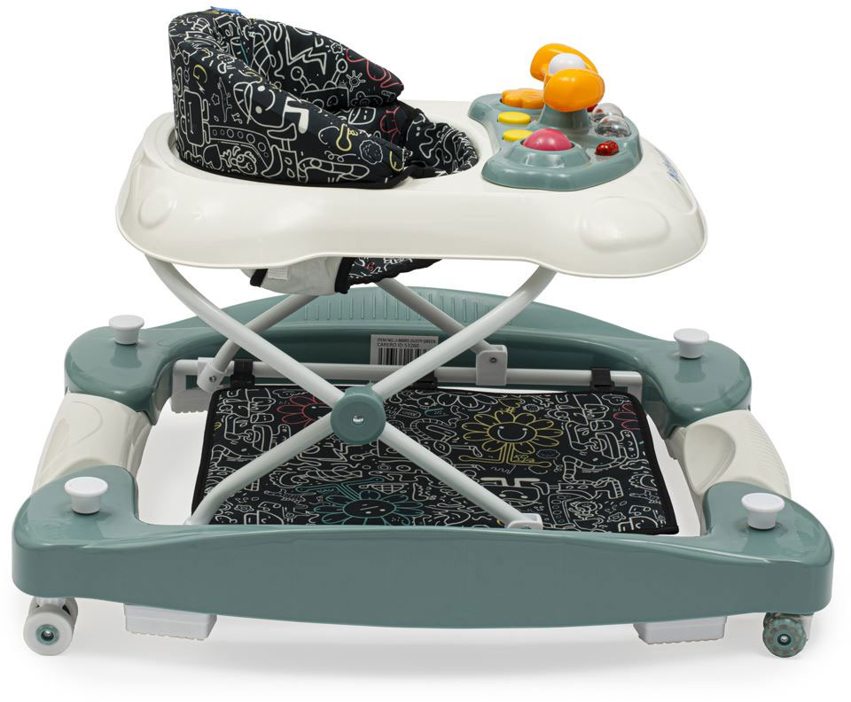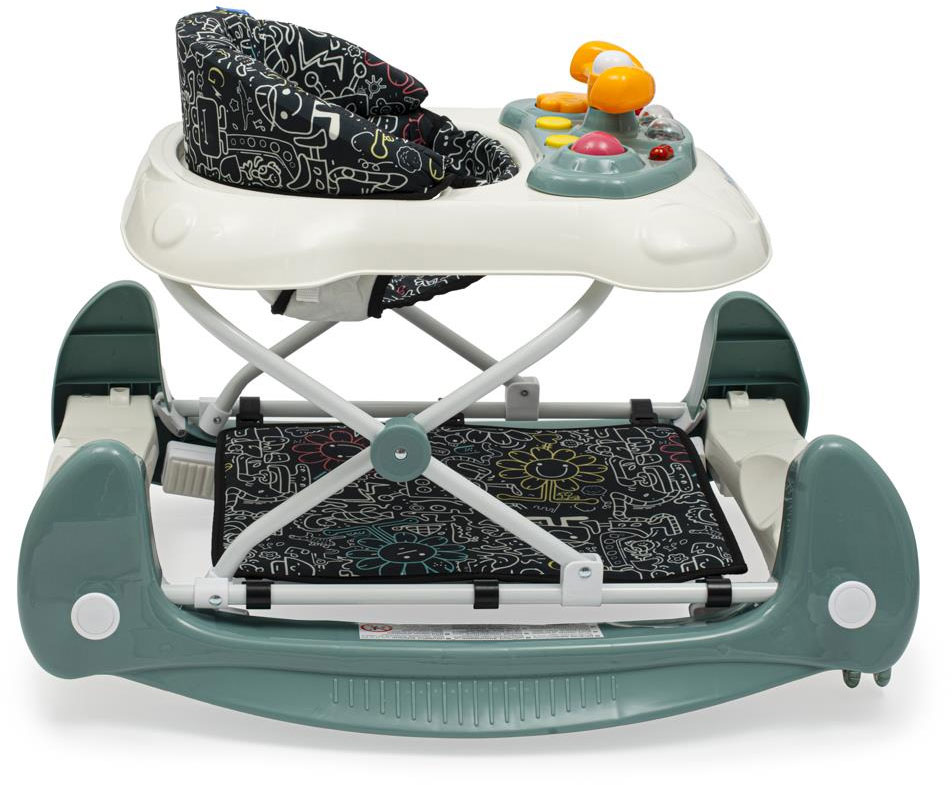 Chodzik Baby Mix z funkcją huśtawki to sposób na zajęcie każdego maluszka powyżej 6. miesiąca życia. Wyposażony w dodatkowy panel z multimediami, da maluszkowi okazję do odkrycia nowych struktur, dźwięków i świateł. Panel składa się z kierownicy z klaksonem, kwiatka, grzechotki, dwóch przycisków grających melodie oraz dwóch światełek.