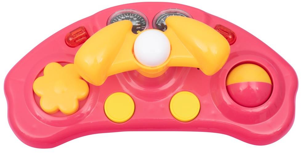 - Wielofunkcyjny panel zabawowy z dwoma pokrętłami i efektami świetlnymi, 12 grających melodyjek, klakson z obrotową kierownicą (zasilany bateriami 2x1,5 V AA - baterie nie są dołączone)