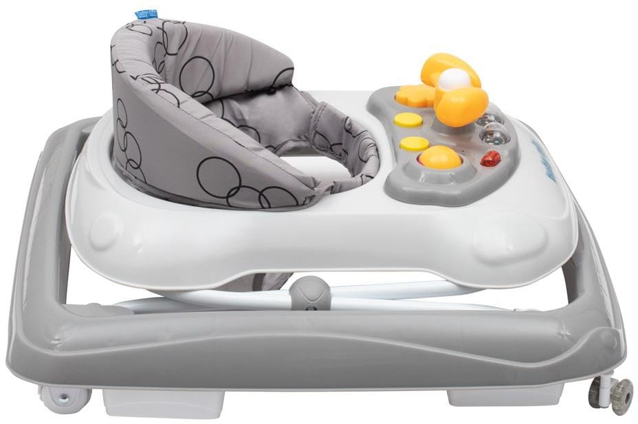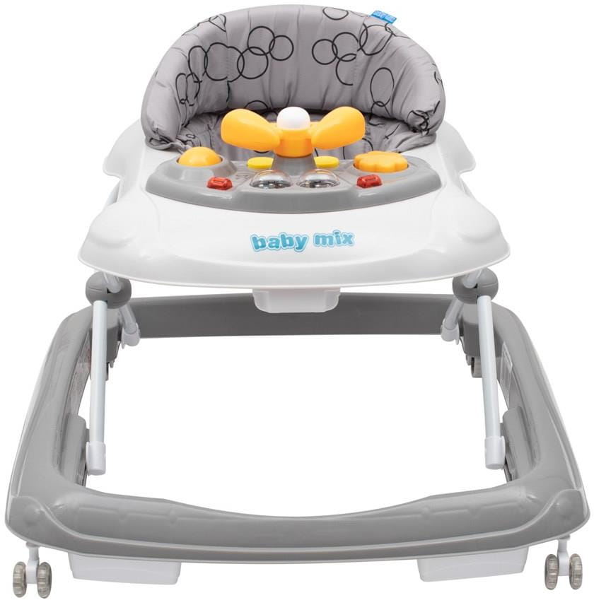 Multifunkcyjny chodzik dziecięcy Baby Mix z silikonowymi kółkami ułatwia naukę chodzenia. Chodzik został wyposażony w wygodne, specjalnie wyprofilowane siedzonko które zapewnia odpowiednią postawę dla kręgosłupa. Wielofunkcyjny panel zabawowy: z efektami świetlnymi, kierownicą z klaksonem, którą można obracać, kwiatek, grzechotkę, dwa przyciski, które grają melodie i dwa światełka. Piękny chodzik z zabawkami oczaruje małych odkrywców i pozwoli im bawić się jeszcze dłużej. Jeździk został wyposażony w specjalny system zabezpieczający przed wywrotką, który zapewni komfort i bezpieczeństwo maluchowi.