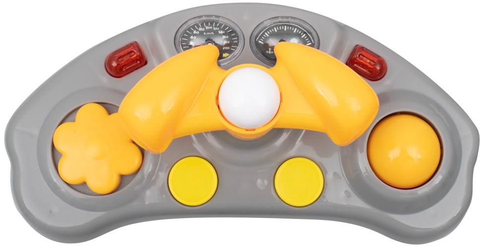 - Wielofunkcyjny panel zabawowy z dwoma pokrętłami i efektami świetlnymi, 12 grających melodyjek, klakson z obrotową kierownicą (zasilany bateriami 2x1,5 V AA - baterie nie są dołączone)