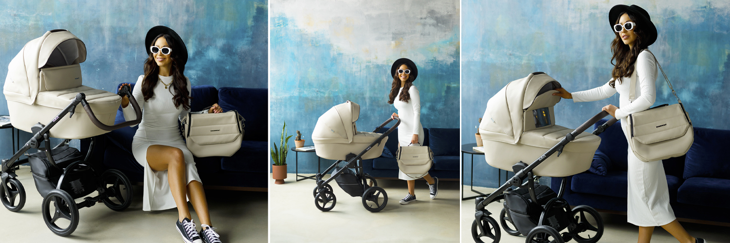 Nowoczesny design tworzą piękne przeszycia na materacyku i torbie, oraz atrakcyjne kolory. W stelaż wózka można wpiąć fotelik samochodowy. Rama jest amortyzowana, posiada zabezpieczenia chroniące przed wstrząsami i blokowaniem się kół.