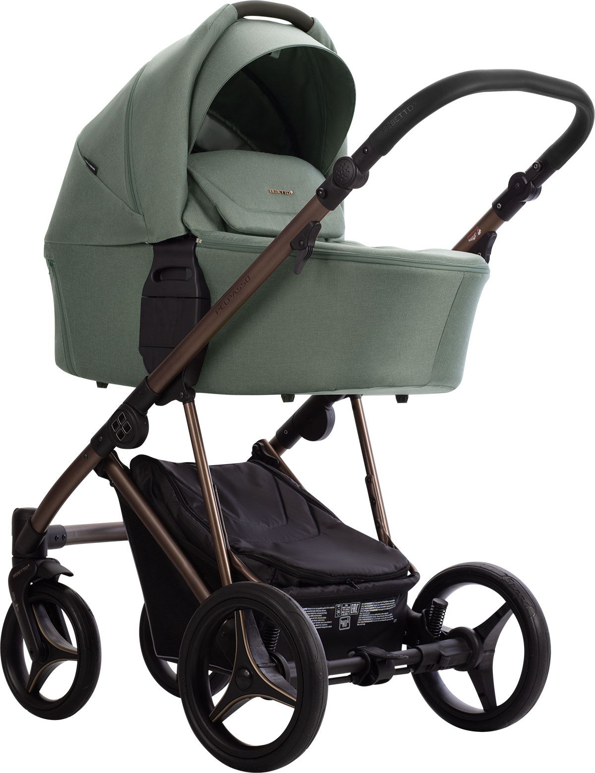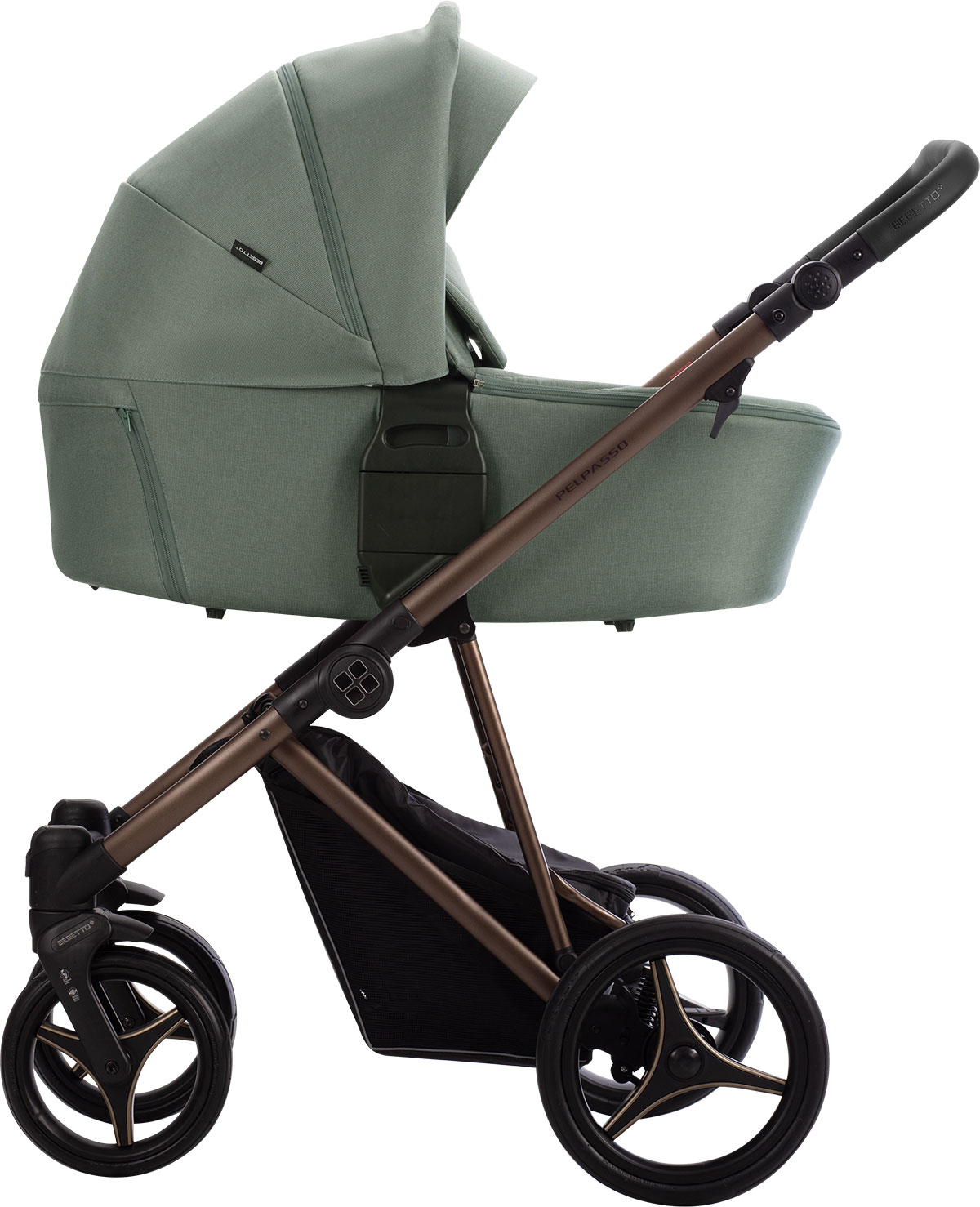 Bebetto Pelpasso jest dostępny w wersji PRO lub standardowej - wersja PRO charakteryzuje się tapicerką z ekoskóry. Wersja standardowa natomiast posiada tapicerki z materiału. Istnieją również dwa stelaże: w kolorze Choco lub Kaszmir.