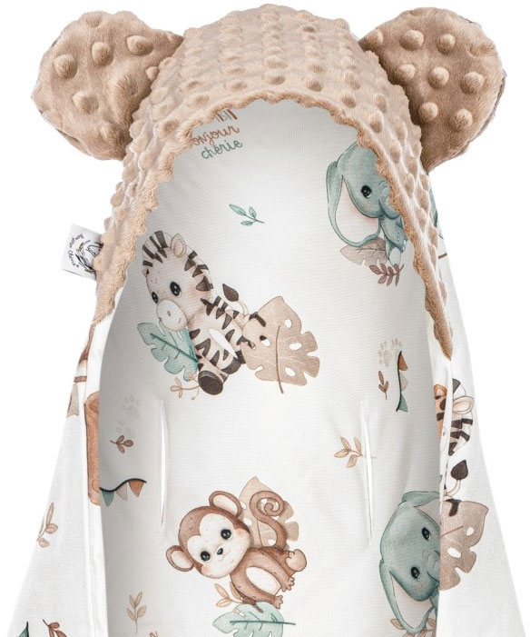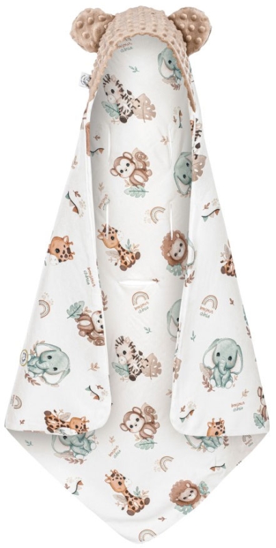 Kapturek wykonano z mięciutkiego pluszu minky, aby zapewnić Twojemu dziecku odpowiednią ochroną przed wiatrem. Środek kocyka wypełniono wysoce puszystą, silikonową i antyalergiczną włókniną. Dzięki temu otulacz zapewnia dziecku miłe uczucie ciepła oraz komfort podczas użytkowania. Kocyk znajdzie swoje zastosowanie również w innych miejscach - jako kołderka, mata, czy mięciutkie okrycie.