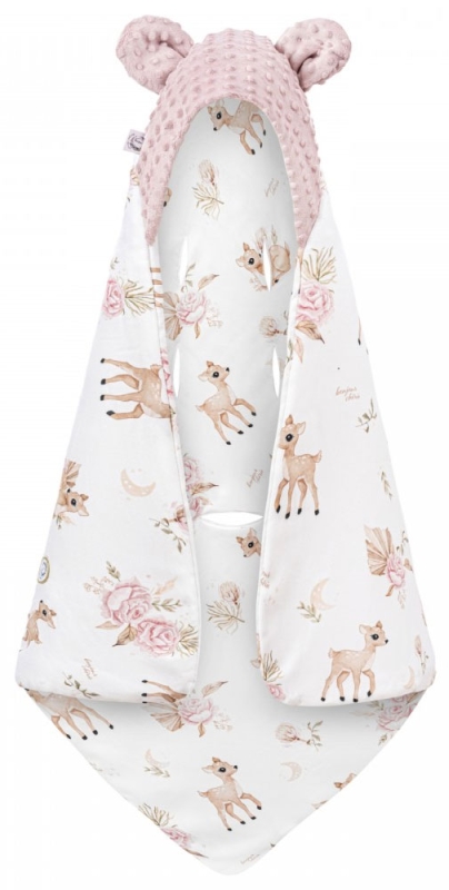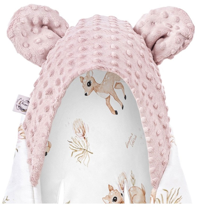 Kapturek wykonano z mięciutkiego pluszu minky, aby zapewnić Twojemu dziecku odpowiednią ochroną przed wiatrem. Środek kocyka wypełniono wysoce puszystą, silikonową i antyalergiczną włókniną. Dzięki temu otulacz zapewnia dziecku miłe uczucie ciepła oraz komfort podczas użytkowania. Kocyk znajdzie swoje zastosowanie również w innych miejscach - jako kołderka, mata, czy mięciutkie okrycie.