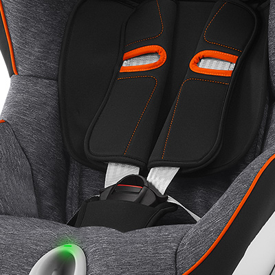 SYSTEM LS Przy pomocy sygnałów świetlnych i dźwiękowych fotelik informuje o prawidłowym zapięciu uprzęży - gwarancja prawidłowego zapięcie oraz naciągu pasów. |