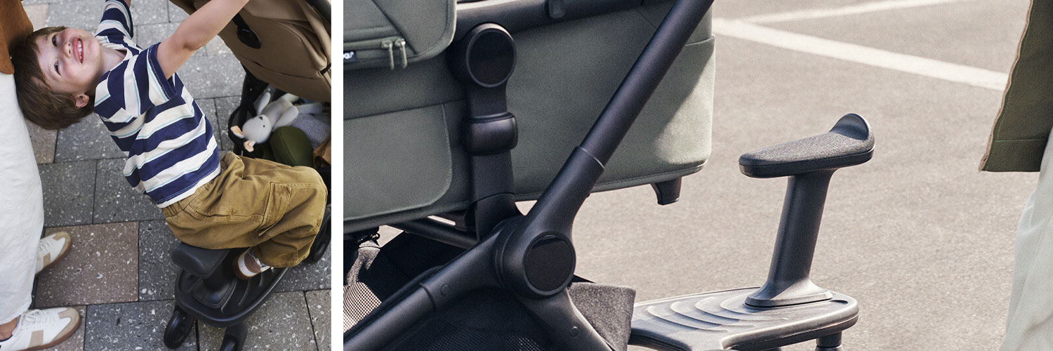 Wygodny podnóżek dla starszaka pasujący do wózków Bugaboo. Jego główną zaletą jest fakt, że posiada nie tylko przestronną deskę do stania, ale również odpinane siedzisko, na którym zmęczony starszak może odpocząć. Dostawka do wózka dla drugiego dziecka pozwoli Ci wygodnie podróżować, bez stresu i nerwów. Deskę można przesuwać na prawo i lewo, aby dopasować ją do aktualnych potrzeb.