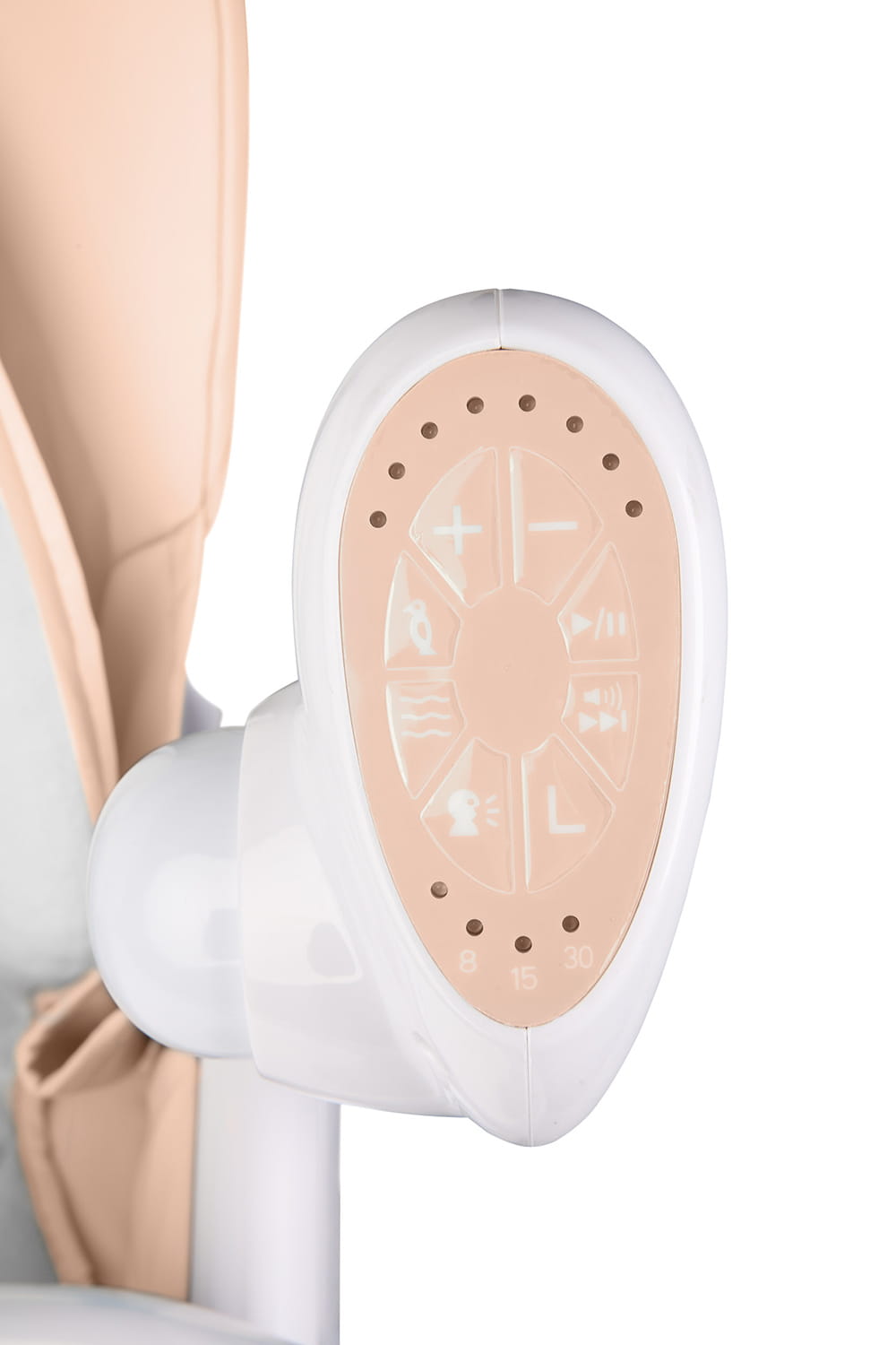 Huśtawką możemy sterować za pomocą specjalnego panelu. Caretero Indigo daje Ci możliwość ustawienia odpowiedniej prędkości huśtania oraz czasówki - trybu automatycznego wyłączenia po 8, 15 lub 30 minutach.