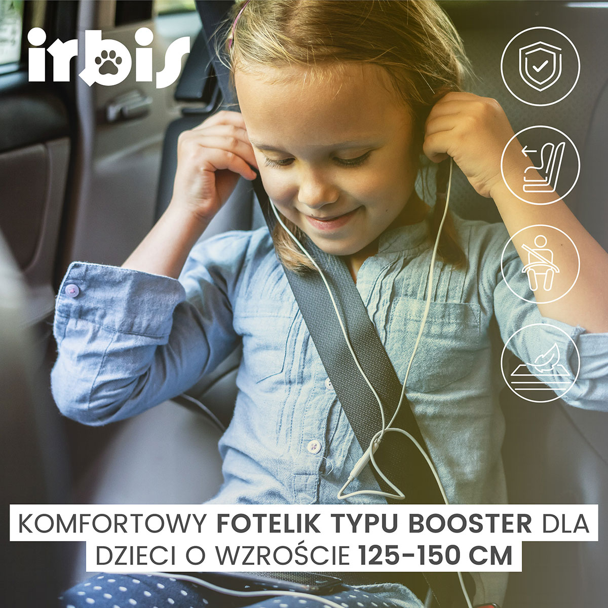Caretero Irbis to fotelik samochodowy typu booster dla starszaków o wzroście 125-150 cm, które nie mogą już podróżować w standardowym foteliku samochodowym, a wciąż potrzebują zabezpieczenia i podwyższenia.