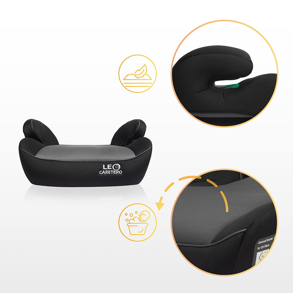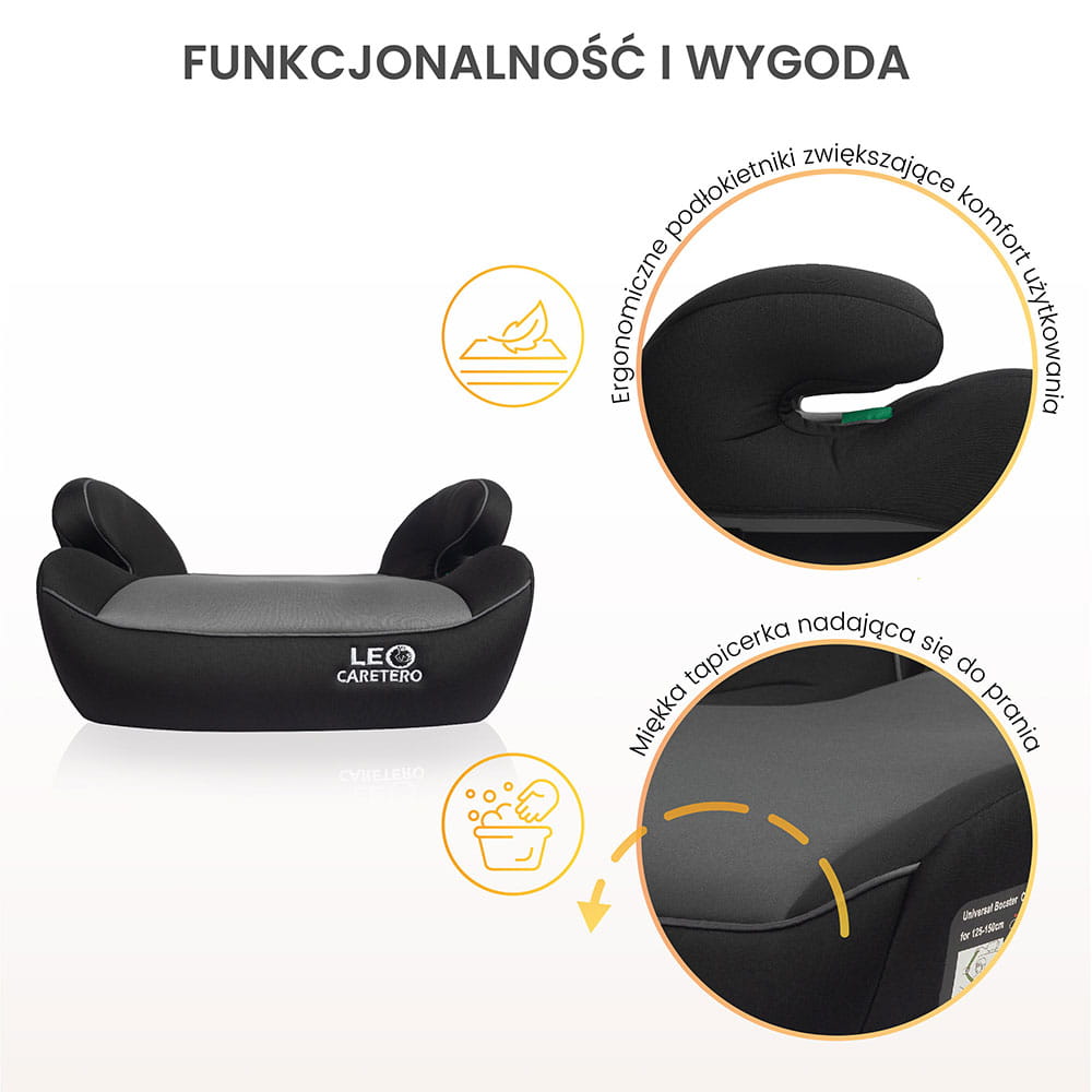 Caretero Leo i-Size to wygodna podstawka w zgodzie z normą i-Size, zaprojektowana z myślą o dzieciach o wzroście 125-150 cm.