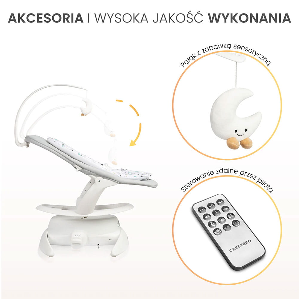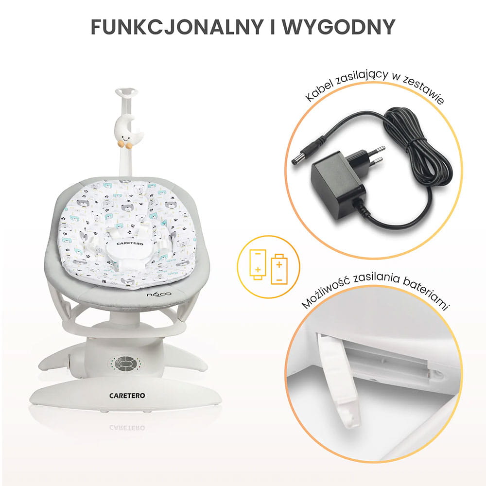 Bujaczek elektryczny NOCO to idealny towarzysz chwil wyciszenia i zabawy dla najmłodszych. Wyposażony w delikatny mechanizm kołyszący, pałąk z zawieszkami oraz uspokajające melodie, tworzy bezpieczną przestrzeń do relaksu i rozwijania zmysłów. Subtelne bujanie koi maluszka, a dźwięki otulają go przyjemną atmosferą, wspierając zarówno odpoczynek, jak i stymulację sensoryczną.