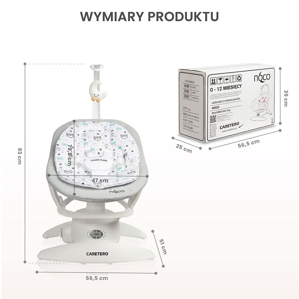 Leżaczek Noco to harmonijne połączenie przemyślanej funkcjonalności z eleganckim, nowoczesnym wzornictwem. Regulowany pałąk z interaktywną zabawką sensoryczną stymuluje rozwój zmysłów i zapewnia dziecku angażującą zabawę. Starannie wykonana, miękka wkładka gwarantuje komfort na najwyższym poziomie, a jej estetyczny design zachwyca zarówno maluchy, jak i rodziców. Dla jeszcze większej wygody, w zestawie znajduje się poręczny pilot umożliwiający zdalne sterowanie wszystkimi funkcjami urządzenia.