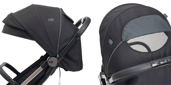 Duża, rozkładana budka wyposażona w filtr UV50+ oraz wodoodporne wykończenie skutecznie chroni malucha przed słońcem, wiatrem i lekkim deszczem podczas letnich wypraw.