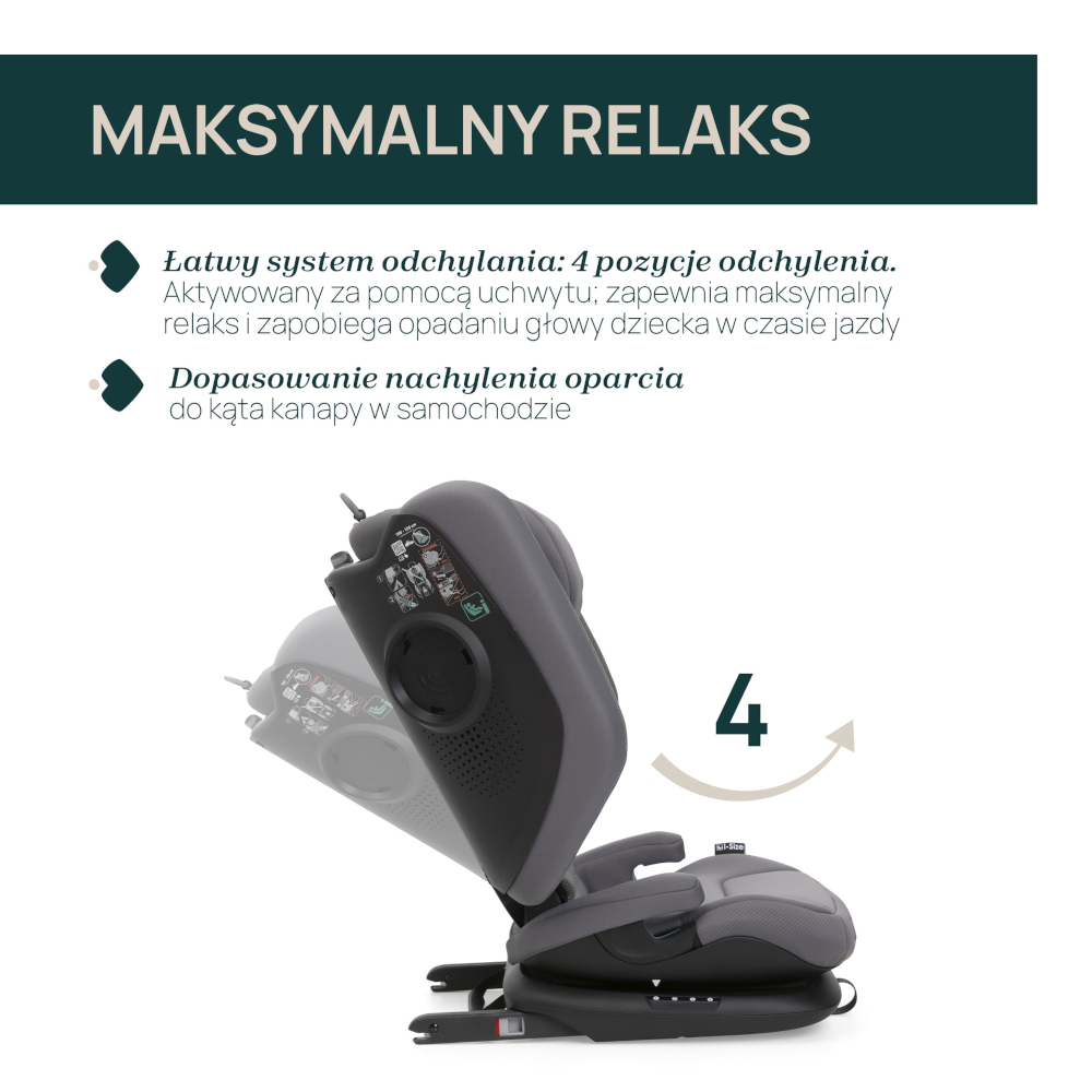 - odchylenie oparcia w 4 pozycjach, co zwiększa komfort w trasie i pomaga utrzymać głowę w lepszym ułożeniu podczas drzemki.