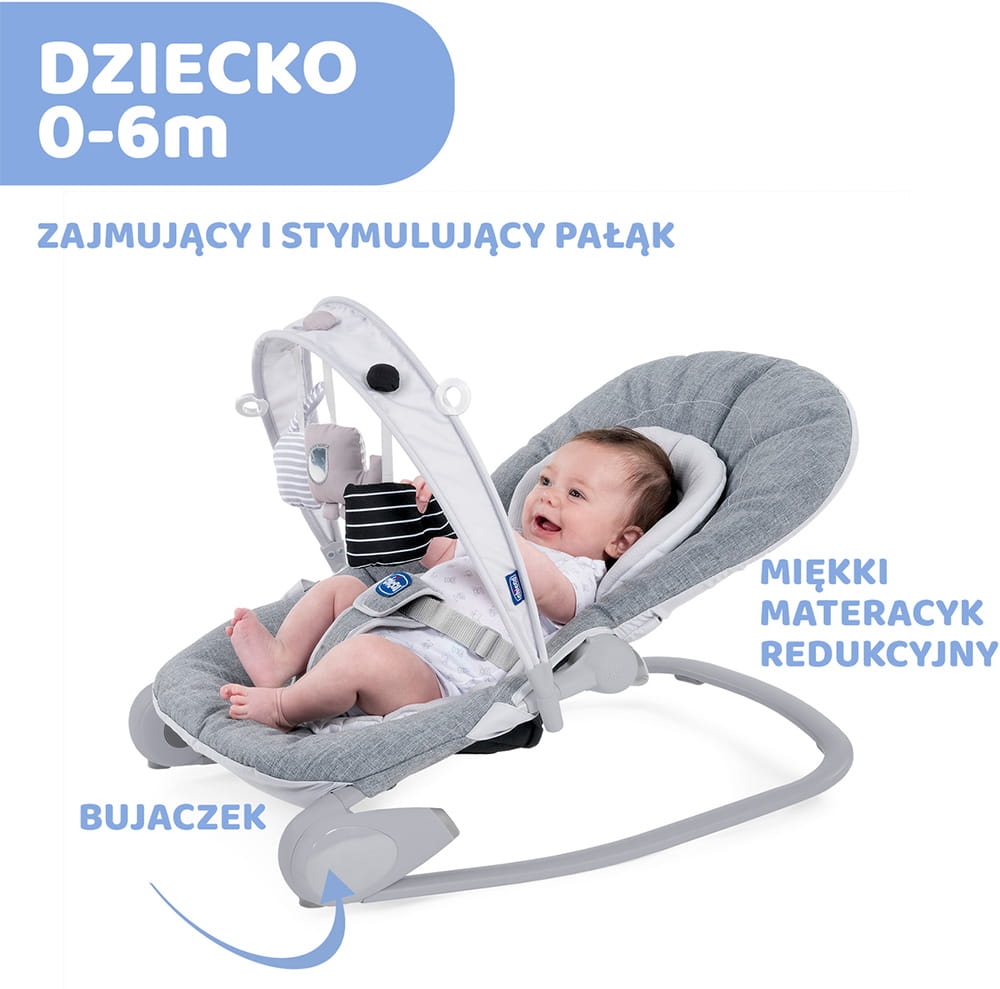 Leżaczek Chicco został dokładnie zaprojektowany, dzięki czemu każdy element współgra ze sobą, tworząc komfortową oraz bezpieczną przestrzeń dla maluszka. Specjalny pałąk z technologią Slide Line umożliwia przesuwanie zabawek wzdłuż pałąka, co pomaga w rozwoju sensorycznym, psychoruchowym i umiejętności poznawczych dziecka.
