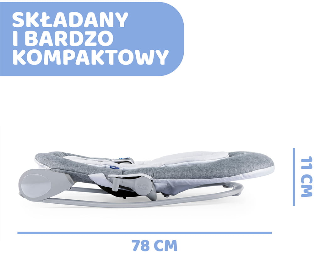 Leżaczek Chicco składa się do kompaktowych rozmiarów, dzięki czemu nie zajmuje zbyt dużo miejsca. Ułatwia to transport i przechowywanie.