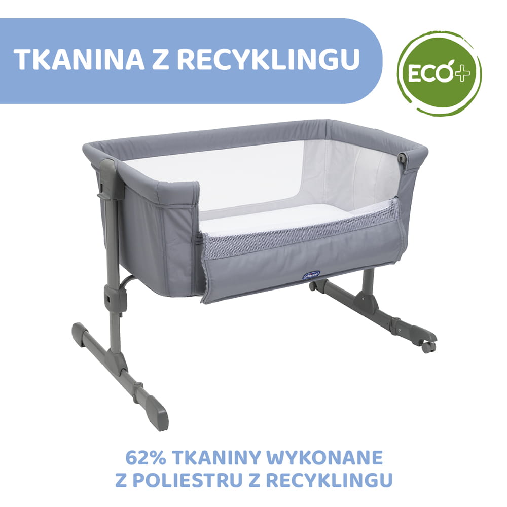 Wersja Essential wyróżnia się zastosowaniem tkanin, które w 62% pochodzą z recyklingu. Wybierając łóżeczko dostawne Chicco Next 2 Me Essential zyskujemy super funkcjonalne i komfortowe łóżeczko, a jednocześnie działamy na korzyść planecie.