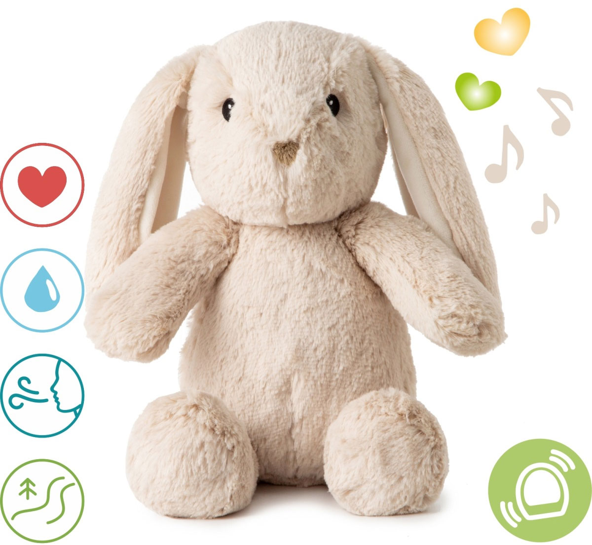 Szumiący króliczek, przytulanka dla dziecka posiada zapięcie na rzep, które umożliwia łatwe przymocowanie do łóżeczka, wózka czy fotelika - króliczek może być zawsze blisko dziecka. Panel dźwiękowy jest wyjmowany - dzięki temu przytulankę można bezpiecznie wyprać w pralce. Wbudowany akumulator i nowoczesne złącze zapewniają wygodę i oszczędność - bez konieczności kupowania baterii. Wysokiej jakości tkaniny są delikatne dla skóry dziecka i spełniają normy bezpieczeństwa.