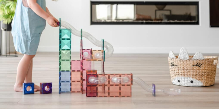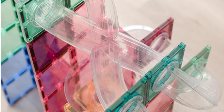 Płytki Connetix mają charakterystycznie fazowane krawędzie, dzięki czemu światło pięknie załamuje się na ich powierzchni. Pastelowe kolory w połączeniu z przejrzystymi rurami i spiralą „X” sprawiają, że kulodrom wygląda jak mała, ruchoma instalacja artystyczna. To zabawka, która zachwyca nie tylko dzieci, ale też dorosłych.