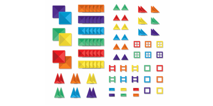 W pudełku znajdują się małe i duże kwadraty, różne rodzaje trójkątów (równoboczne, prostokątne, równoramienne), a także ogrodzenia, okna i ramy drzwi. Dzięki temu można tworzyć realistyczne budynki, zamknięte przestrzenie, tarasy, mury czy ogrody. Elementy specjalne dodają konstrukcjom charakteru - dom z oknami i drzwiami od razu staje się bardziej „prawdziwy”, co zachęca do zabawy w odgrywanie ról.