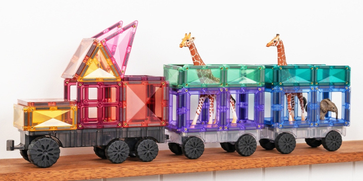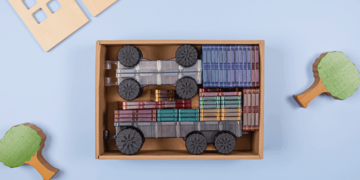 W zestawie znajdziesz jedno szare dwustronne podwozie oraz dwa przezroczyste podwozia z gumowymi kółkami, które stanowią bazę do budowy przeróżnych środków transportu. Wystarczy dołożyć magnetyczne płytki w pastelowych kolorach, aby zamienić je w ciężarówkę, pociąg z wagonami, samolot, karetkę, wóz strażacki, wózek widłowy albo zupełnie wymyślony pojazd z dziecięcej wyobraźni.