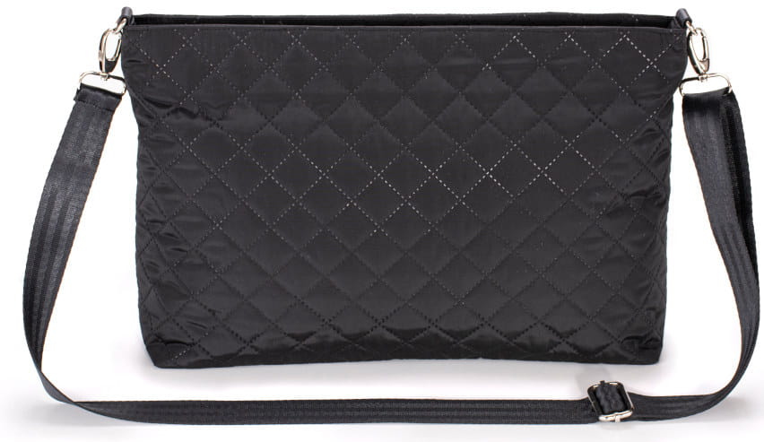 Torebka i organizer w jednym posiada 3 kieszenie wewnętrzne - jedną na suwak oraz dwie na gumkę - oraz 2 kieszonki zewnętrzne. Taka ilość jest wystarczająca do zabrania na spacer najpotrzebniejszych przedmiotów.