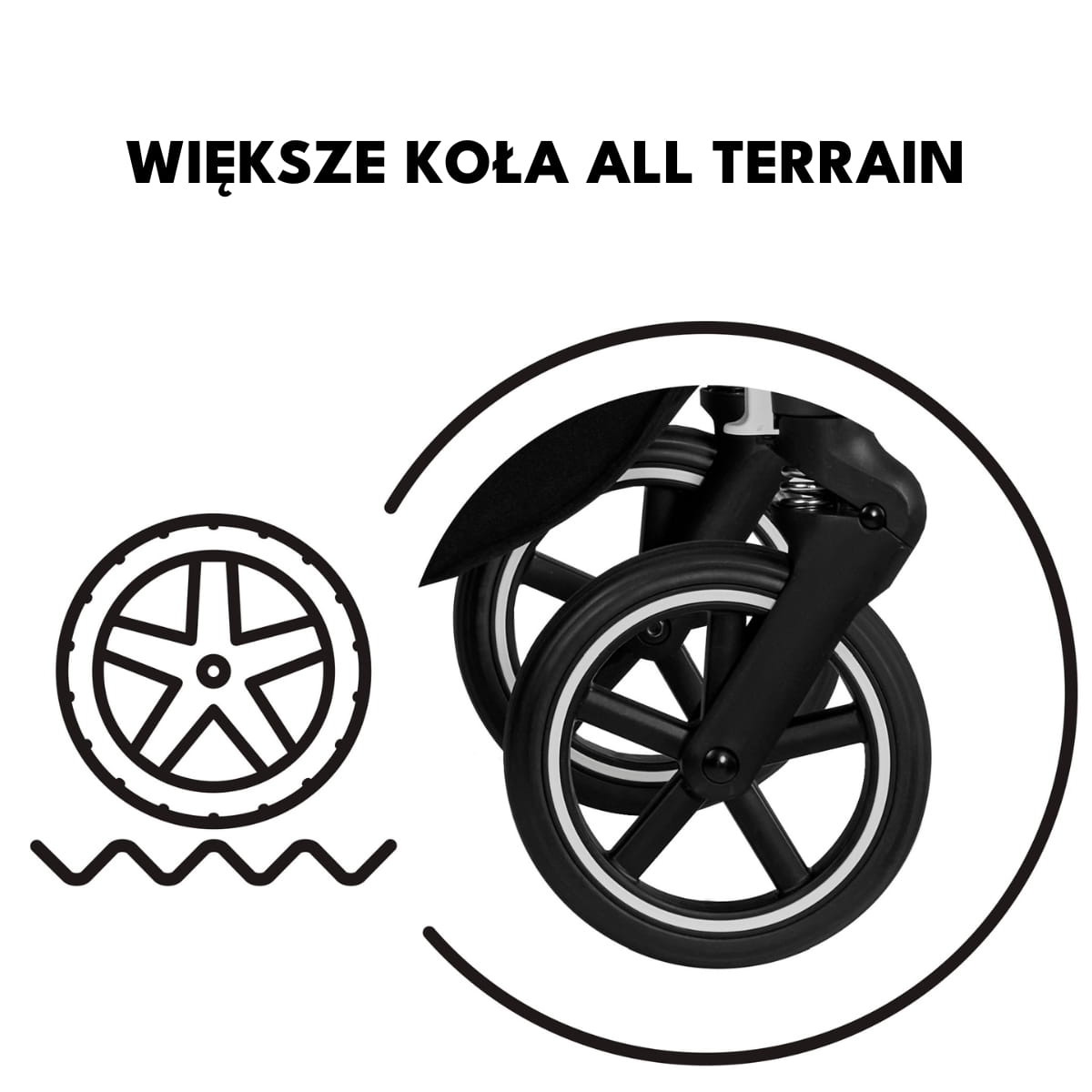 Wszystkie cztery koła wózka są amortyzowane, dzięki czemu jazda jest bardzo płynna i elastyczna. Łatwość manewrowania i maksymalna lekkość prowadzenia da rodzicowi komfort podczas każdej podróży.