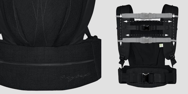 Regulowany pasek mostkowy zwiększa stabilność ramion, przez co jest wygodniej i bezpieczniej. Dodatkowo w pasie biodrowym znajduje się specjalna kieszonka zamykana na suwak, do której rodzic może schować najpotrzebniejsze akcesoria.