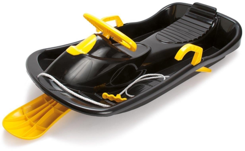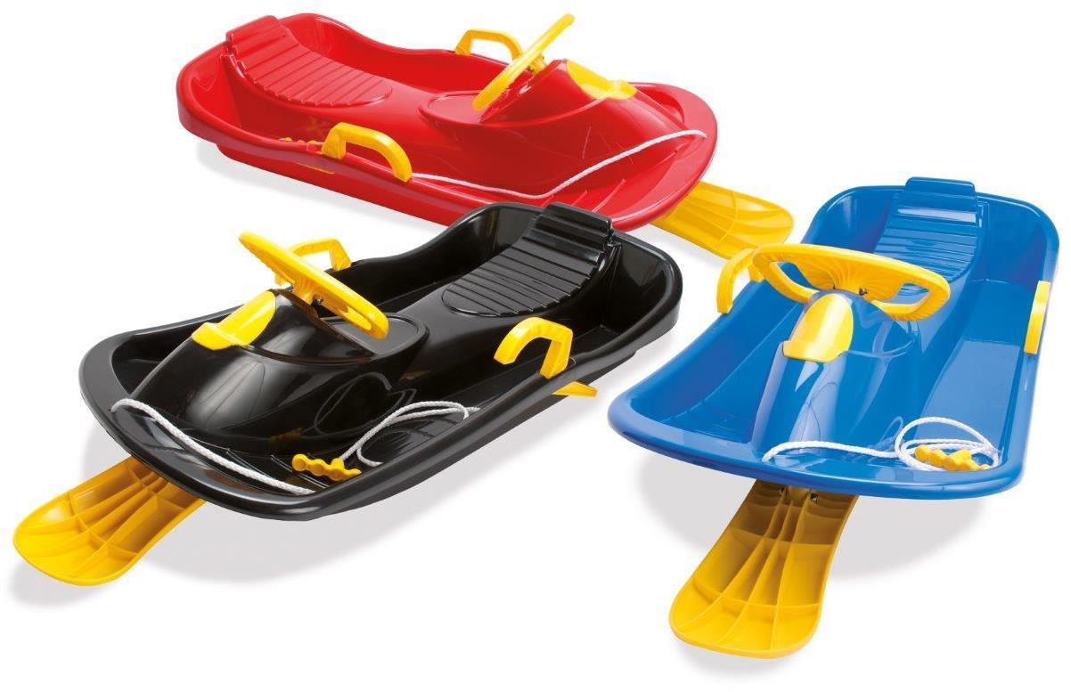 Stabilne, wytrzymałe i sterowane kierownicą sanki typu bobslej z szerokim siedzeniem, nartką i hamulcami. Wytrzymują wstrząsy i duże prędkości na trasie zjazdu z toru saneczkowego. Wyposażone są w linkę i uchwyty, dzięki czemu można łatwo je ciągnąć. Wzmacniają zmysł równowagi i rozwój fizyczny dziecka. Sprawiają, że zabawa na śniegu jest o wiele przyjemniejsza! Sanki są dostępne w 3 kolorach: czerwony, niebieski i czarny, a najważniejsze elementy typu kierownica, nartka sterująca i boczne hamulce są żółte.