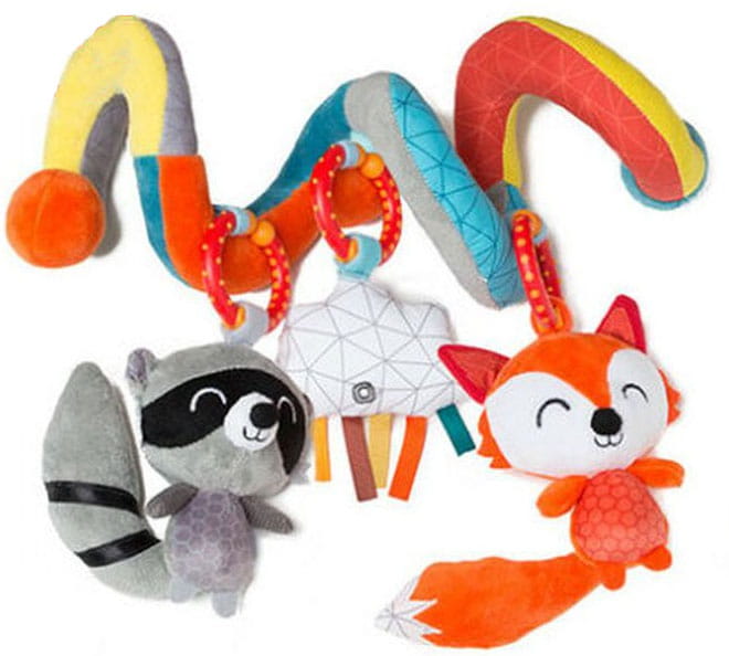 Wielofunkcyjna zabawka w formie spirali marki Diono zapewni maluszkowi dobrą zabawę niezależnie od miejsca, w którym się ona odbywa. Spirala składa się z pluszowych zawieszek wyposażonych w specjalne uchwyty, za pomocą których zabawki można odczepić aby bawić się nimi osobno. Spirala zabawkowa Diono daje dziecku wiele możliwości rozwoju, jej konstrukcja pozwala na montaż na pałąku wózka spacerowego, gondoli, fotelika samochodowego czy łóżeczka. Miękkie materiały i brak ostrych elementów dbają o bezpieczeństwo malucha.