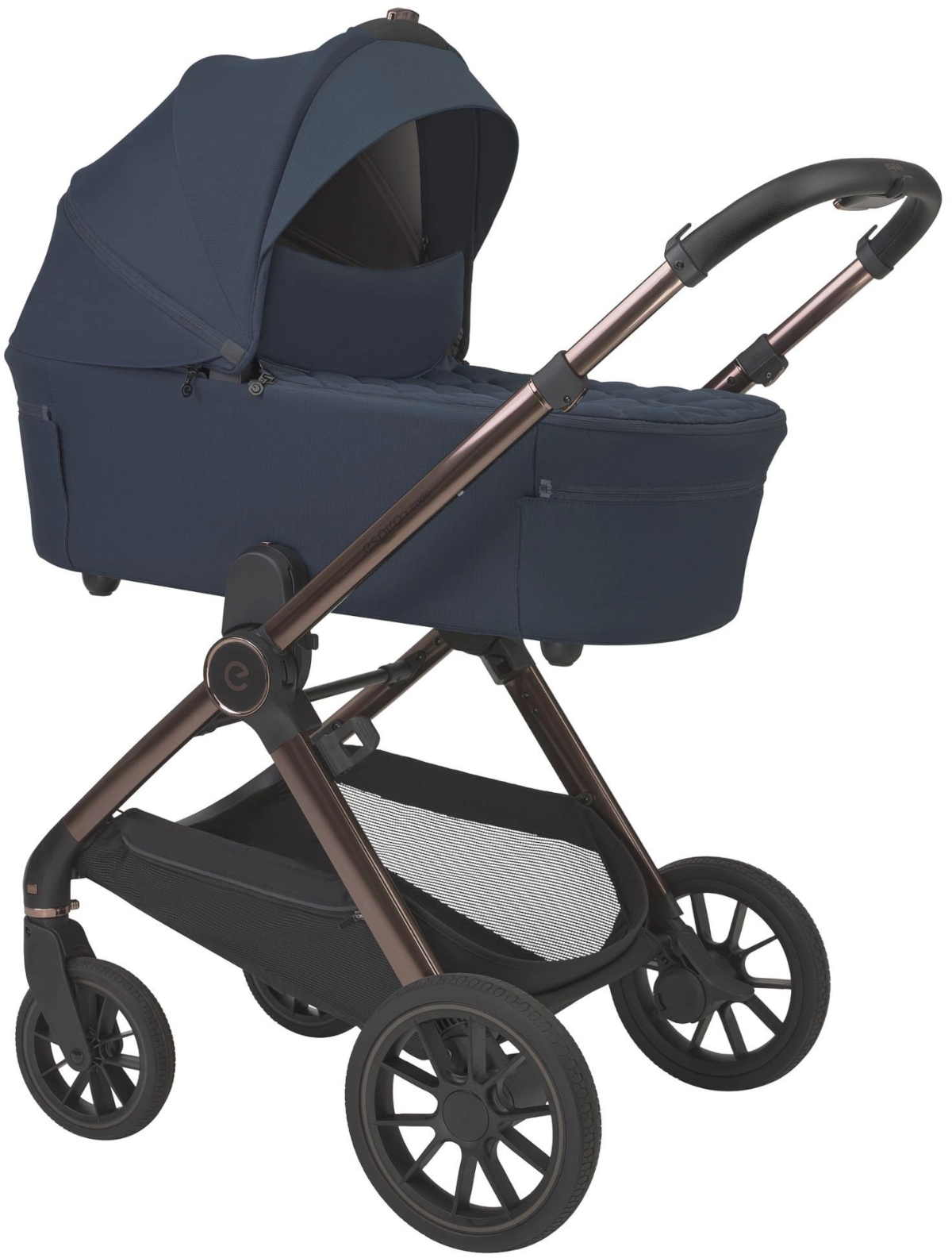 Bezobsługowe koła EVA z zewnątrz zostały pokryte warstwą gumy. Są doskonale amortyzowane, dzięki czemu wózek dziecięcy Espiro Code nadaje się do jazdy w każdym terenie. W dolnej części konstrukcji znajduje się obszerny kosz zakupowy, który pomieści wszystko, co trzeba.