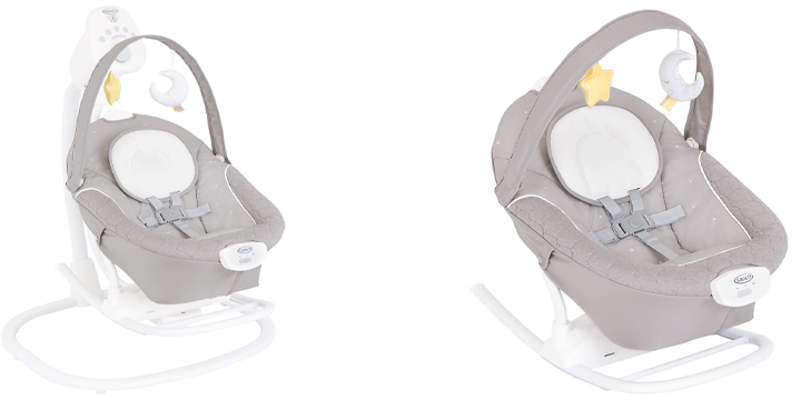 Graco Softsway to produkt wielofunkcyjny - możemy korzystać z niego w formie huśtawki, lub samodzielnego leżaczka. Wystarczy wypiąć siedzisko z konstrukcji huśtawki. Łatwy w przenoszeniu leżaczek możemy zabrać ze sobą, gdy mamy potrzebę przejść do innego pomieszczenia. Nieważne, gdzie - zawsze razem.