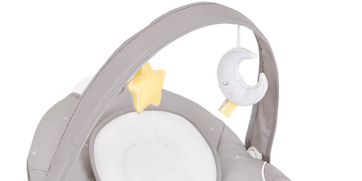 Wraz z huśtawką dołączono pałąk z zabawkami zapewniającymi maluchowi rozrywkę. Huśtawka zapewnia rodzicowi mobilność dzięki możliwości wypięcia samego leżaczka - wówczas stelaż huśtawki zostaje na miejscu, a malucha w lekkim leżaczku zabieramy ze sobą.