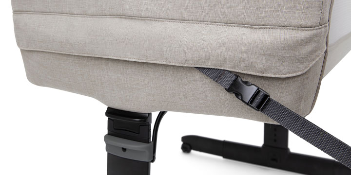 Wysokość łóżeczka jest regulowana w 5-stopniowym zakresie, dzięki czemu dostawimy Roomie Go do większości łóżek. Możliwość ustawienia delikatnego pochylenia materaca zwiększy komfort podczas katarku i przy częstym ulewaniu.