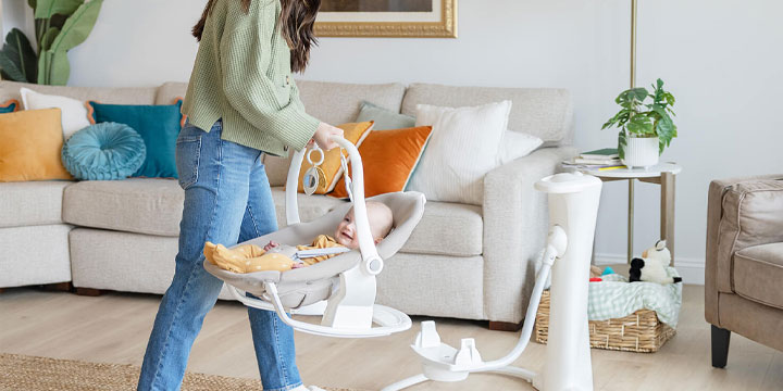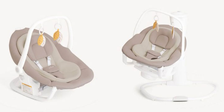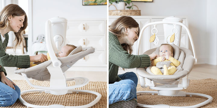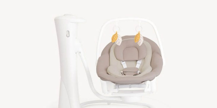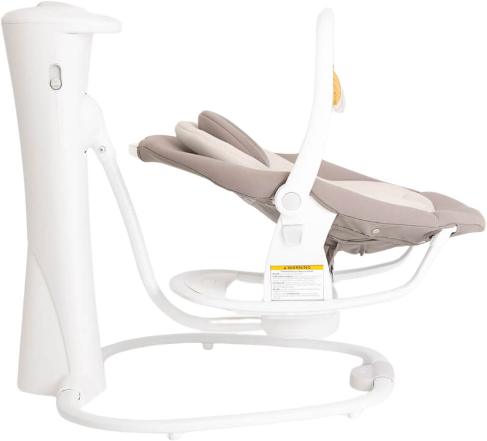 Modułowa konstrukcja pozwala obrócić siedzisko o 90°, dzięki czemu możesz wybrać ruch przód-tył lub delikatne kołysanie na boki, idealnie naśladujące ramiona rodzica.