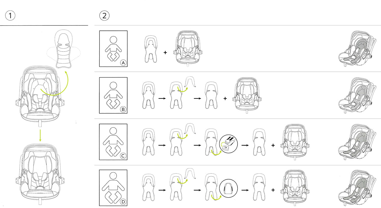 Indywidualnie dopasowywana poduszka w obszarze głowy wspiera wrażliwe i nierozwinięte w pełni mięśnie szyi i karku. Wbudowany naciągacz krokowy oferuje bezpieczne trzymanie dziecka niezależnie od wzrostu i zapobiega jego wyślizgnięciu się z nosidełka.