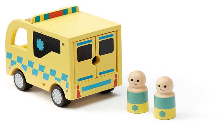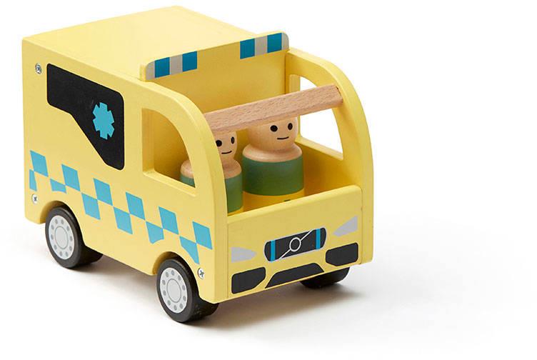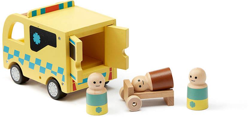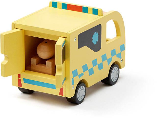 W tej drewnianej zabawkowej karetce spotkasz ratowników medycznych Jen i Jorgena oraz pechowego, ale cierpliwego Hana. Na szczęście w karetce są nosze z kółkami, na których Han może leżeć. Nosze można wtoczyć tylnymi drzwiami i zablokować na czas jazdy. Jen uwielbia prowadzić. Jorgen dobrze opiekuje się pacjentem, gdy pędzą do szpitala. Więc zapnij pasy i w drogę!