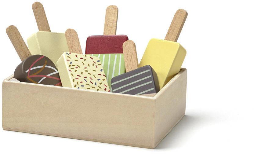 6 różnych drewnianych lodów na patyku.