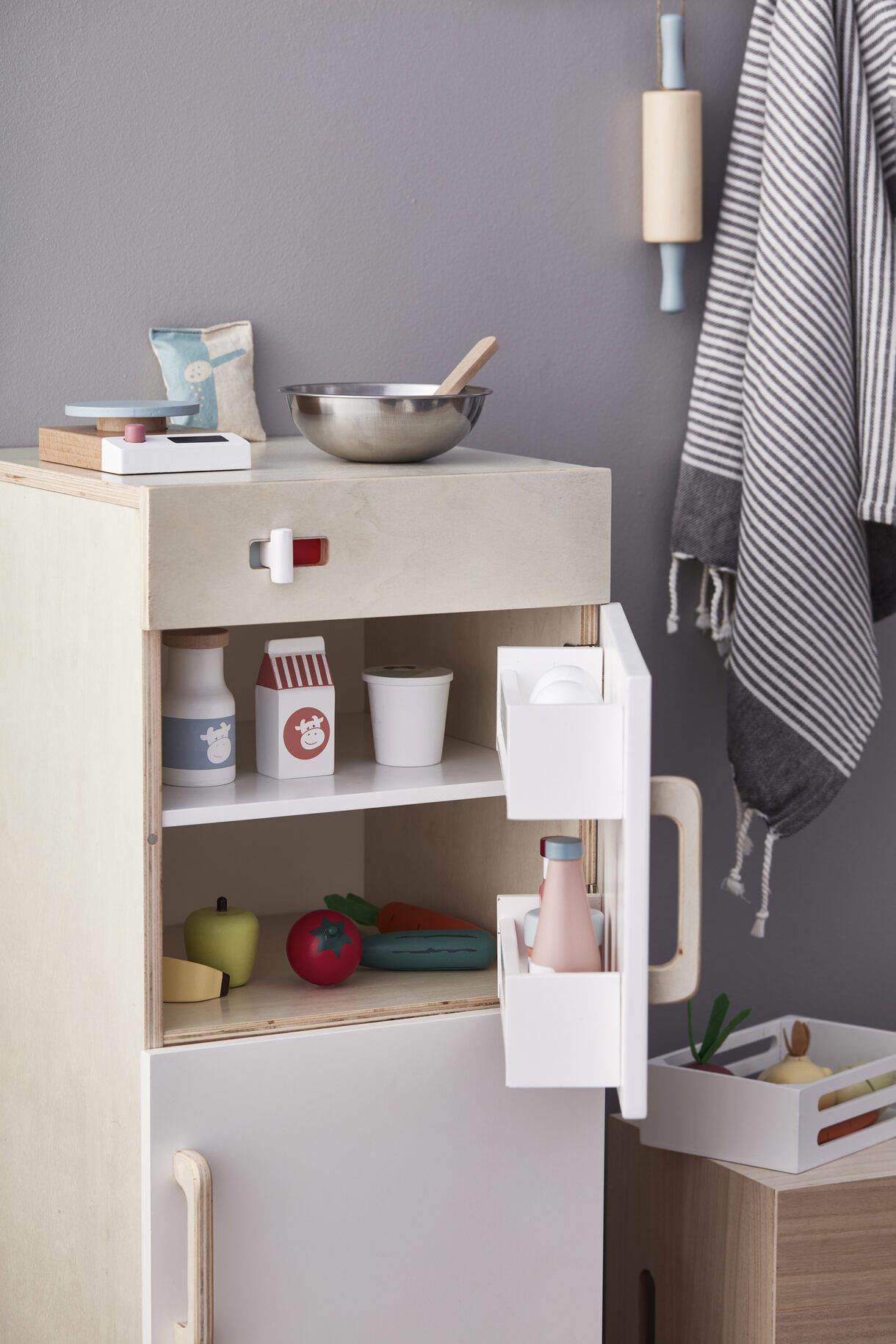 Dzieci będą się dobrze bawić, układając i przechowując żywność na półkach i w przegródkach, jakie można znaleźć w domowej lodówce z zamrażarką. W lodówce znajdziesz 2 wewnętrzne półki na drzwiach, jedną z 2 pojemnikami na jajka i dodatkową szufladę na dole, na warzywa i owoce. Suwak do regulacji temperatury. Klikający przycisk włączania/wyłączania. Zabawka wymaga złożenia przez osobę dorosłą.