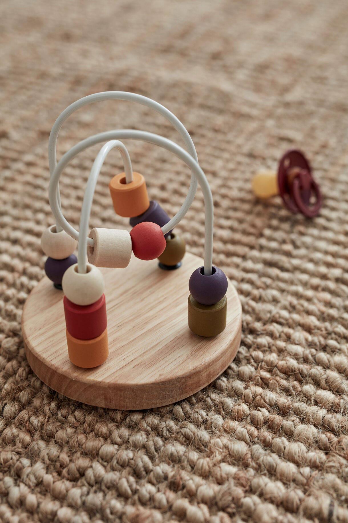 Składa się z trzech torów i 15 drewnianych koralików w różnych kolorach. Labirynty z koralików pomagają dziecku doskonalić koordynację wzrokowo-ruchową i rozwijać zdolności motoryczne, a jednocześnie są zabawką, która sprawia wiele radości.