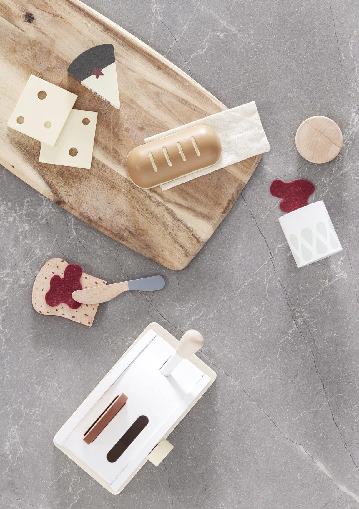 Drewniany toster z 8 akcesoriami. Użyj dźwigni, aby podnieść opiekane kromki. Za pomocą pokrętła wybierz stopień wypieczenia. W zestawie: słoik dżemu, 2 kromki chleba, 2 plastry sera, 2 porcje dżemu i nóż do smarowania. W pudełku znajduję się 10 elementów. Informacje dodatkowe: Materiał Toster: sklejka. Pokrętło, dźwignia: schima. Akcesoria: schima, drewno bukowe, sklejka. Dżem: poliester. Zabawka nieodpowiednia dla dzieci poniżej trzeciego roku życia Certyfikaty: EN71, wykonane z drewna z certyfikatem FSC, oznaczenie CE Instrukcja czyszczenia: Czyść wilgotną ściereczką. Wytrzyj do sucha czystą szmatką.