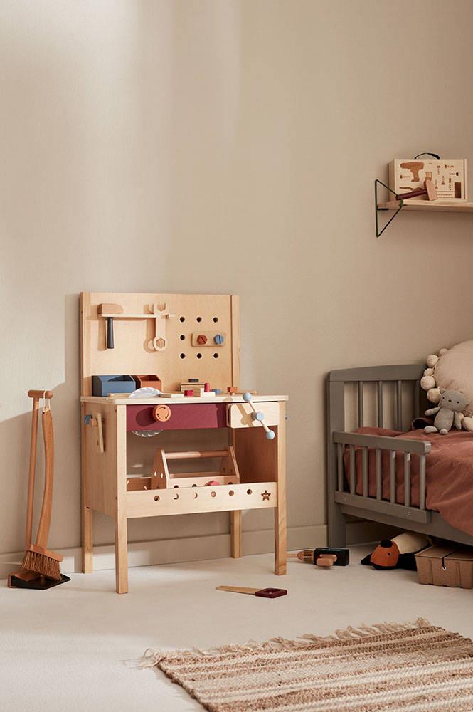 Oto idealny zestaw dla małego majsterkowicza. Skrzynka narzędziowa, wykonana z drewna z certyfikatem FSC, z łączeniami typu jaskółczy ogon, ucieszy dzieci, które uwielbiają przykręcać i naprawiać różne rzeczy. Wiertarka pracując, wydaje dźwięk „klik-klik”. Zmieniając bity, możesz w dowolnym momencie przekształcić ją w śrubokręt. Zestaw zawiera również zabawkowe śrubki znajdujące się w drewnianym pudełku z gwintowanym otworami na spodzie, w które można je wkręcić. Do najtrudniejszych prac budowlanych możesz również użyć śrubokręta ręcznego lub obcęgów. W zestawie jest też kątownik, na wypadek, gdybyś musiał coś zmierzyć, i abyś miał pewność, że wszystko jest prosto zamontowane. Z przodu pudełka znajdują się wypalone rysunki narzędzi. Jest także tekstylny uchwyt, dzięki czemu możesz zabrać skrzynkę ze sobą, gdy twój przyjaciel lub dziadek potrzebuje pomocy. Po tym, jak od nich wyjdziesz, żaden obraz nie będzie już krzywo wisiał. Zestaw zawiera: * walizkę narzędziową *wiertarkę/śrubokręt *bity i wiertła * sześć zabawkowych śrubek * drewniane pudełko z gwintowanymi otworami *kątownik *obcęgi *ręczny śrubokręt Informacje dodatkowe: Materiał Skrzynka narzędziowa, małe pudełko, bit: sklejka lipowa. Śruby, śrubokręt ręczny, wiertło: brzoza. Kątownik, obcęgi: buk. Wkrętak: brzoza, buk. Rączka skrzynki: bawełna. Wymiary: Śrubokręt: 15x4,5x11,5 cm. Kwadrat: 15,5x9,5x1 cm. Obcęgi: 11x4 cm. Zabawka nieodpowiednia dla dzieci poniżej trzeciego roku życia Certyfikaty: EN71, wykonane z drewna z certyfikatem FSC, oznaczenie CE Instrukcja czyszczenia: Czyść wilgotną ściereczką. Wytrzyj do sucha czystą szmatką.