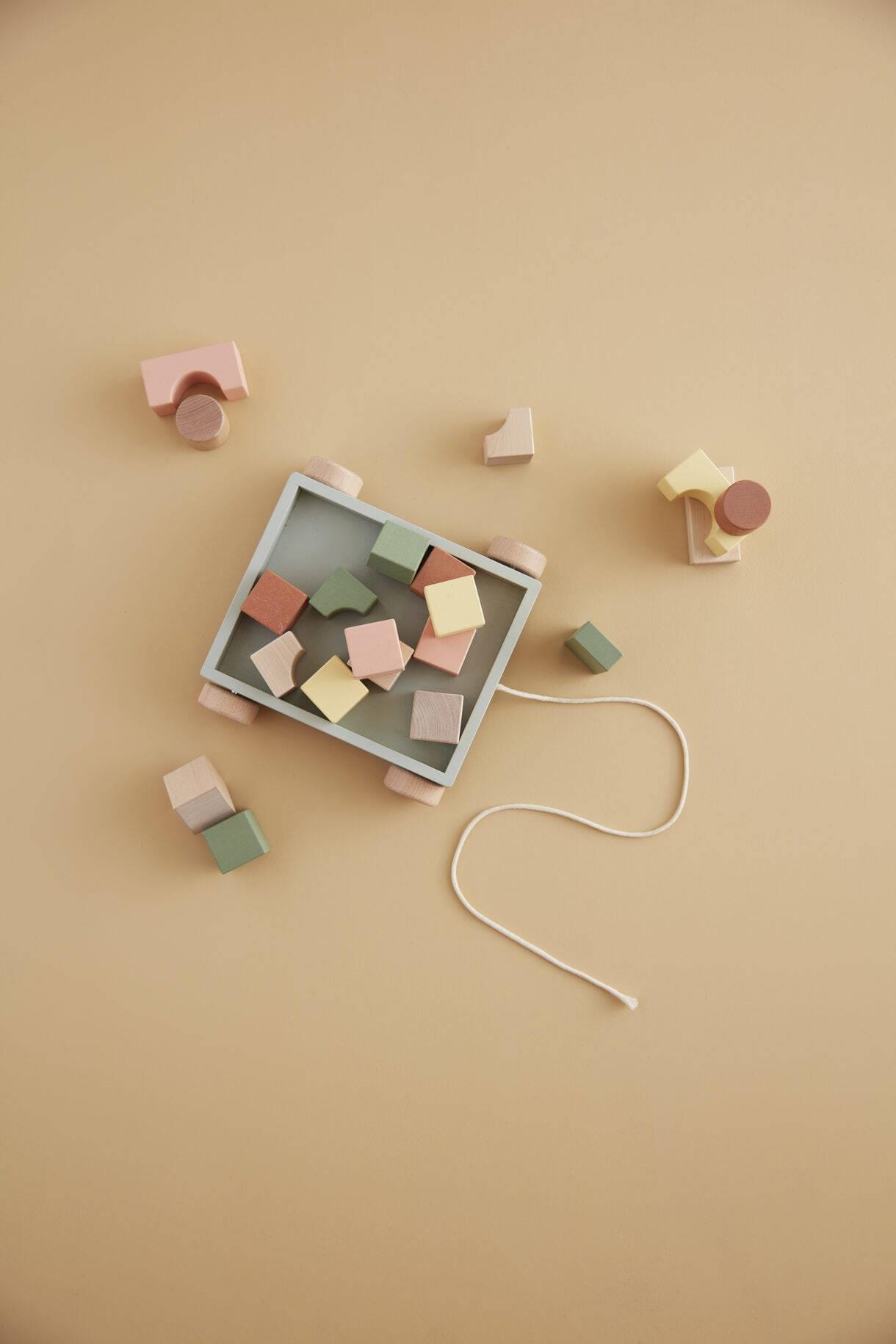 Wózek do ciągnięcia w kolorze naturalnego drewna z 20 bejcowanymi drewnianymi klockami to dwie klasyczne zabawki w jednym.