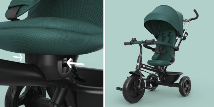 Aston 2 Plus oferuje regulację oparcia do pozycji półleżącej w obu kierunkach jazdy. To rzadka i niezwykle cenna funkcja w rowerka trójkołowych, która umożliwia dziecku regeneracyjną drzemkę podczas dłuższego spaceru bez konieczności powrotu do domu.