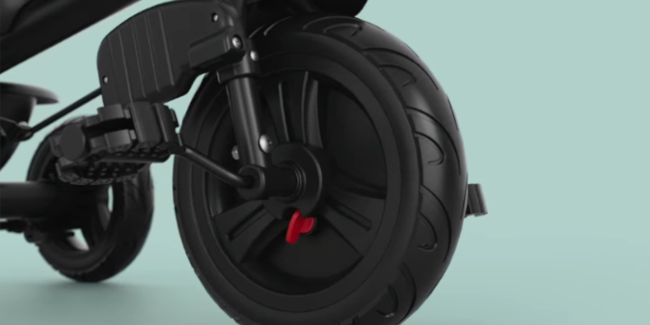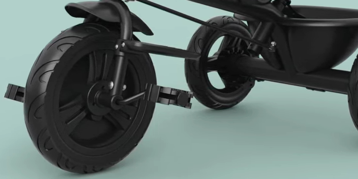 Specjalny mechanizm w przednim kole sprawia, że dziecko może intensywnie pedałować "na sucho", podczas gdy to rodzic za pomocą rączki decyduje o faktycznym tempie i kierunku podróży. Eliminuje to ryzyko nagłych szarpnięć i uderzeń pedałami w nóżki.