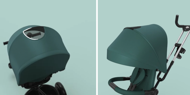 Duża, regulowana budka skutecznie chroni przed słońcem i wiatrem. Wbudowane okienko pozwala rodzicowi na stały podgląd malucha, szczególnie w konfiguracji tyłem do kierunku jazdy, zapewniając poczucie bezpieczeństwa obu stronom.