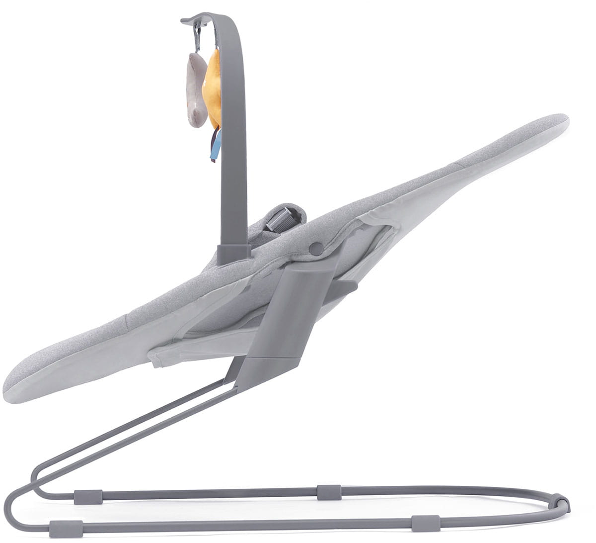 Leżaczek wyposażono w pałąk z pluszową zabawką, która sprzyja rozwojowi motoryki - zachęca malucha do wyciągania rączek.