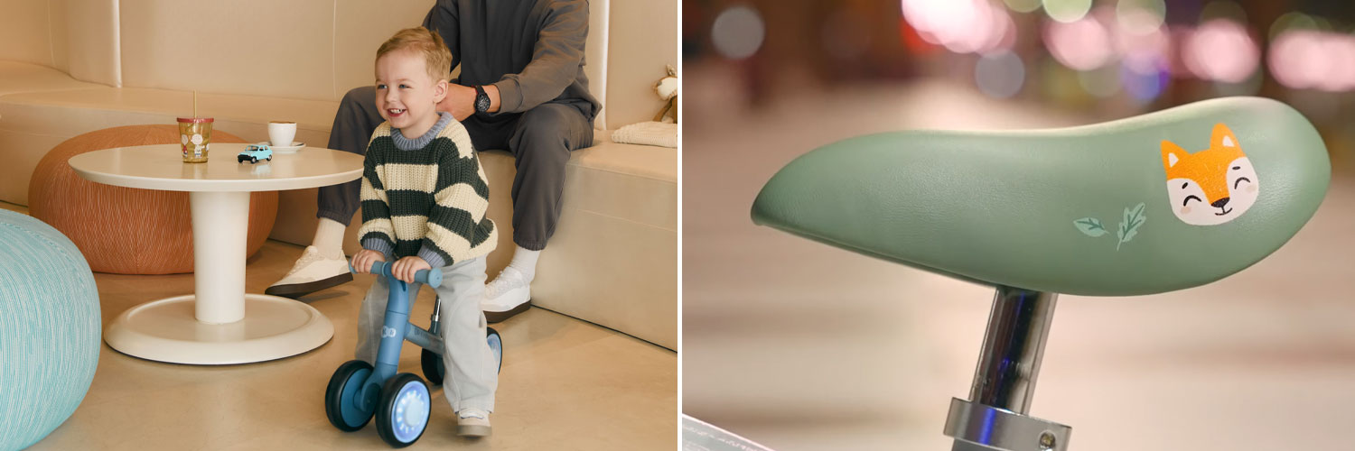 Cutie Flash został zaprojektowany z myślą o komforcie i stylu – miękkie siedzisko z ekoskóry jest łatwe do utrzymania w czystości, a jego urocze zwierzęce motywy wywołują uśmiech za każdym razem, gdy dziecko wsiada na rowerek. Ergonomiczne uchwyty TPR i ogranicznik skrętu kierownicy zapewniają małym rączkom wygodę i bezpieczeństwo, a Tobie – pewność, że maluch uczy się jeździć w kontrolowanych warunkach.